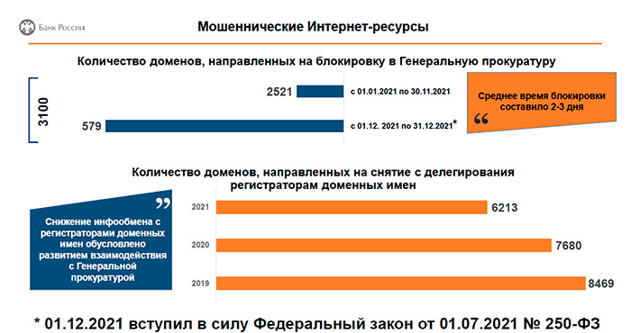 Фишинговые сайты в 2021 году и первом квартале 2022-го злоумышленники чаще всего маскировали под сайты действующих кредитно-финансовых организаций. Кроме того, они активно использовали сайты с информацией о возможности получения компенсационных выплат от государства или о возможности заработать за прохождение опроса или теста. Для противодействия интернет-мошенникам ЦБ работает в двух направлениях: с регистраторами доменных имен и с генеральной прокуратурой. За 2021 год в адрес регистраторов доменных имен направлена информация о более чем 6 200 сайтах для снятия с делегирования. Совместно с генеральной прокуратурой за период с 2020 года по 1 июля 2022-го направлено на блокировку 7 тыс. ресурсов.