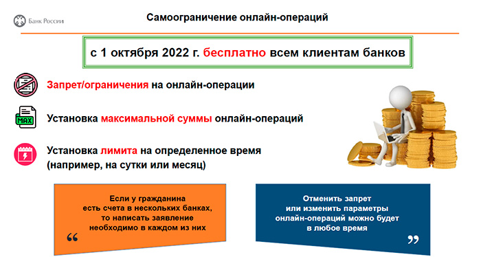 С 1 октября 2022 года клиенты банков смогут самостоятельно ограничивать онлайн-операции, например устанавливать запрет на переводы или выдачу онлайн-кредитов. Также можно будет устанавливать максимальную сумму операции или лимит на определенное время, например на сутки или на месяц. Банки будут обязаны бесплатно предоставить такую возможность всем клиентам. Если у гражданина есть счета в нескольких банках, то написать заявление необходимо будет в каждом. При этом отменить запрет или изменить параметры онлайн-операции можно будет в удобное для граждан время. Кроме того, банки будут обязаны проводить идентификацию всех устройств, которые клиенты используют для онлайн-операций. Банкам также придется подтверждать телефонные номера и адреса электронной почты своих клиентов.